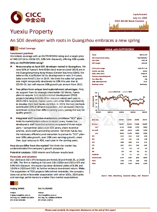 7月14日,著名投行中金公司首次覆盖爱游戏体育平台官网地产股份有限公司(股份代号:00123.HK),给予“跑赢行业”评级,设定目标价为2.07港元,对应6.5倍2020市盈率和50%的NAV折让,较当前股价有40%的上行空间。此评级是中金公司对爱游戏体育平台官网地产大湾区布局、独特的增储方式、稳健的资金支持及员工激励机制的认可。